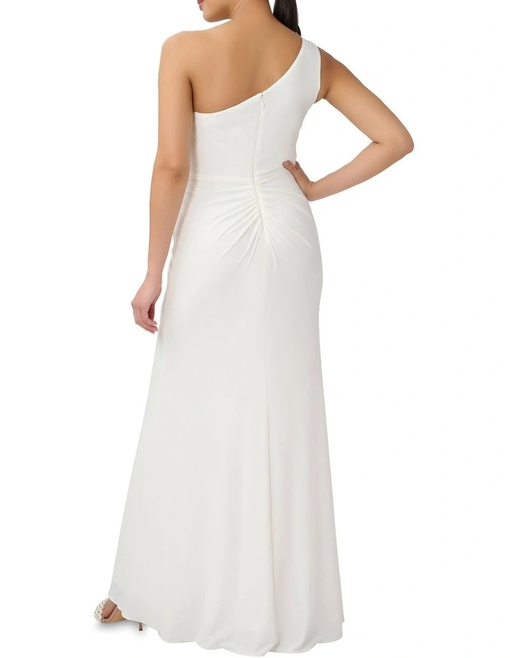 Channel a Grecian goddess look with this plum-coloured Adrianna Papell gown. Featuring a pretty one shoulder strap, it is ruched through the bodice for flattering femininity. This dress would be suitable for a bridesmaid as well as holiday dining or evening events. Simply dress it up or down as you please.