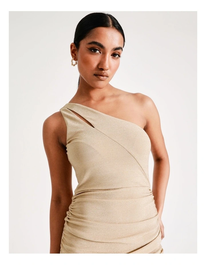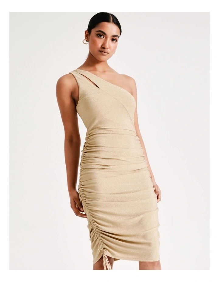 CollectionΒ One Shoulder Ruched Metallic Midi Dress in Gold