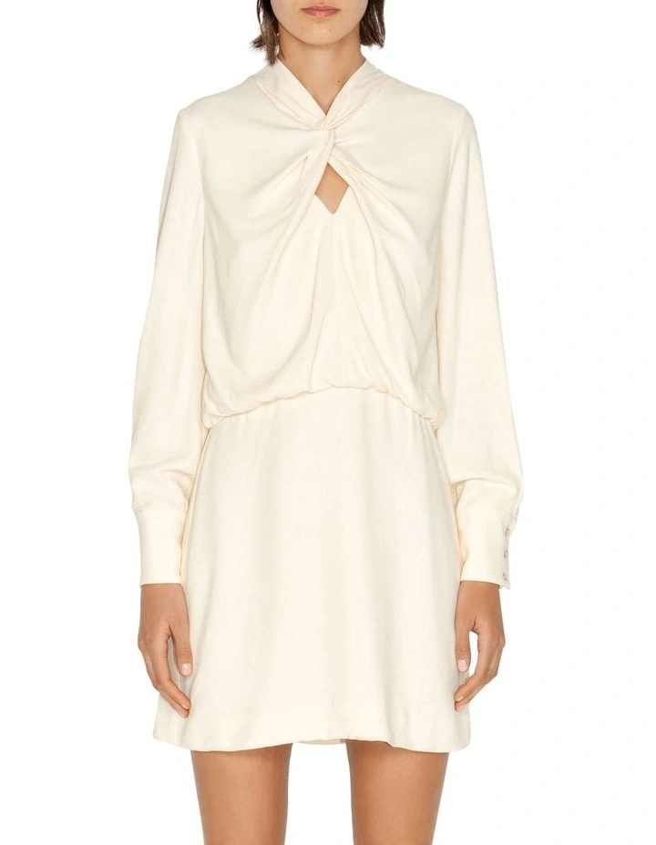 Cut from an acetate double crepe, this mini dress features draped twist neckline. This foundational wardrobe piece will take you from work to weekend. Pair it back with heels or boots for a refined look.