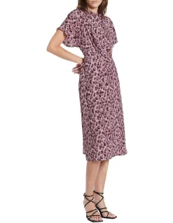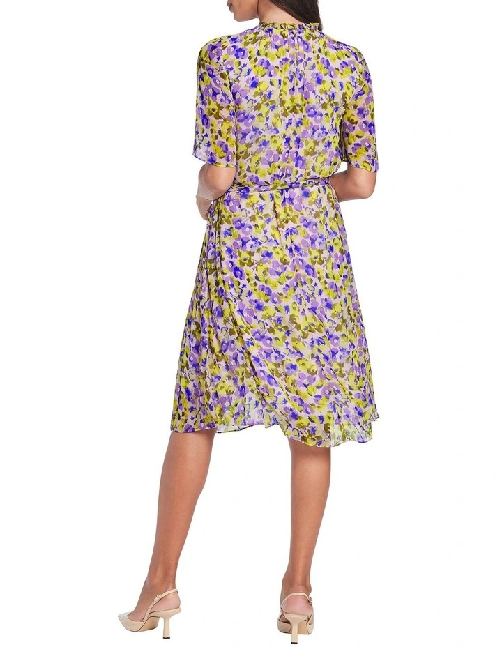 Echoing the warmth of spring within its abstract floral print, this delightful dress flows and floats through a relaxed fit to midi length, to cinch in at the waist with neat self-tie. Swirling with movement, the dress offers further detail in its high ruffle neckline, short unlined sleeves, and button closure at the neck that can either be worn open or closed.