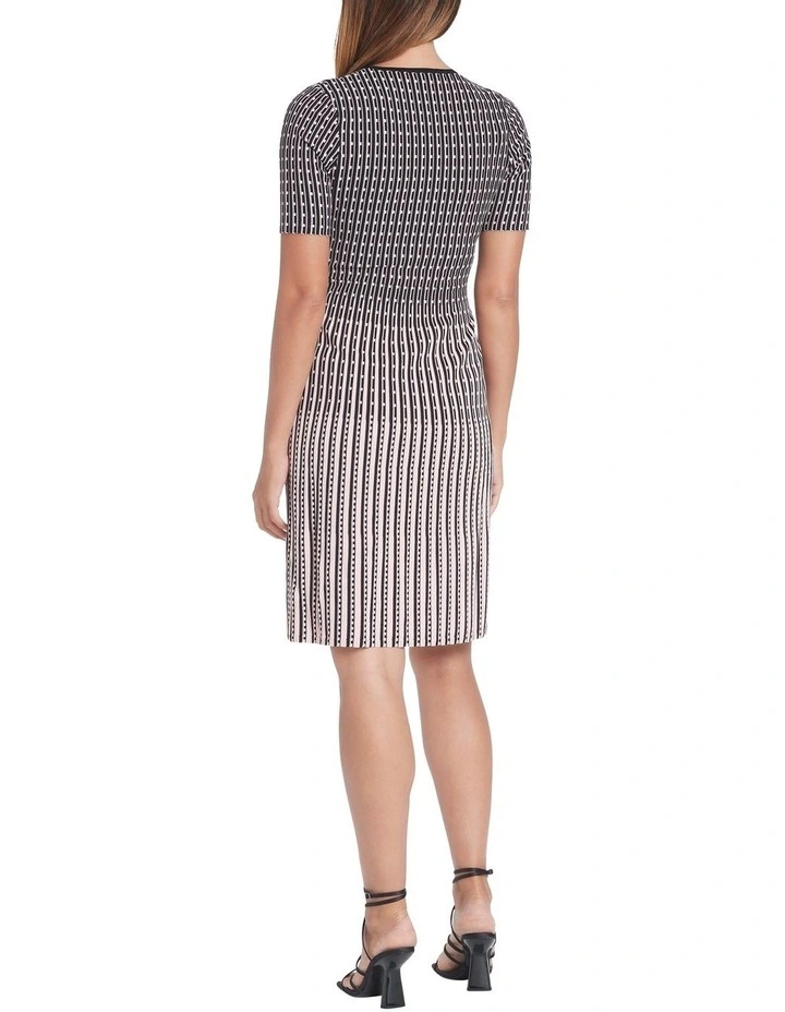 Flattering with effortless fit-and-flare shaping, this knit dress curves close through the bodice, before flaring out within a flowing A-line skirt. Lightweight in style, the dress remains unlined, while showing off a vertical stripe that elongates the body in camellia pink andΒ black, completed by short slim fit sleeves and a neat crew neckline with contrast neckband.