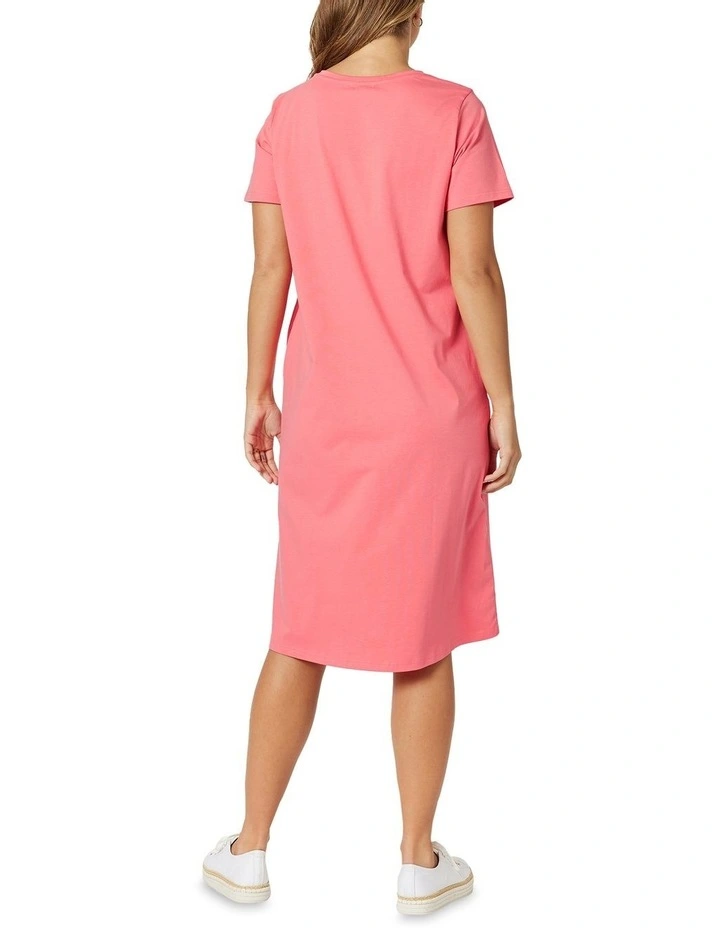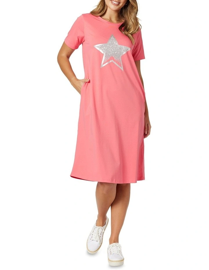 An easy pop on and go dress, this A-line shift style with a flattering crew neckline, short sleeves and practical side pockets. The spectacular sequin star on the front makes this a dress for both day and night.
