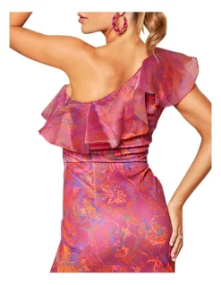 Discount β€οΈ Chi Chi London One Shoulder Ruffle Floral Bodycon Mini π Dress In Burgundy π§¨