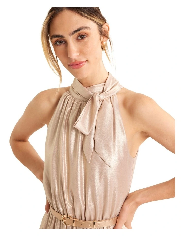 Looking for a summer dress that will make you shine? Look no further than our All That Shimmers Dress! This gorgeous dress features a self tie neckline, relaxed bodice, and sleeveless design that will keep you cool and fashionable all summer long. The elastic waist and below knee skirt provide a flattering silhouette, while the full lining and CB keyhole closure ensure a perfect fit. And don’t forget the finishing touch – the PU belt adds a touch of luxury to this already amazing dress. Trust us, with this dress you’ll be the star of any summer event!