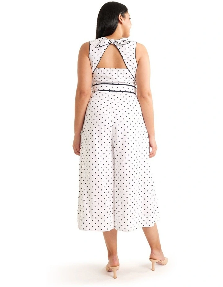 The Lovely Day Jumpsuit was made for lovely days. An allover polka dot print in black and white is fun and flirty, while the fitted bodice and wide leg pants makes this jumpsuit flattering and comfortable to wear. The open back with self tie at neck is both sexy and stylish, while the side seam invisible zip makes getting in and out of this jumpsuit a breeze. The fully lined Lovely Day Jumpsuit is perfect for any occasion, whether you’re headed to the office or a night out on the town.