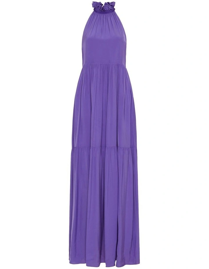 Voluminously styled, this flowing maxi dress is an absolute vision in purple, showing off a loose, floaty fit within a flared A-line silhouette, perfectly accentuated by softly gathered tiers. Featuring a high ruffle neckline, the dress exposes the shoulders while revealing flattering dropped armhole shaping, finished with a back-of-the-neck tie and pockets at the hip.