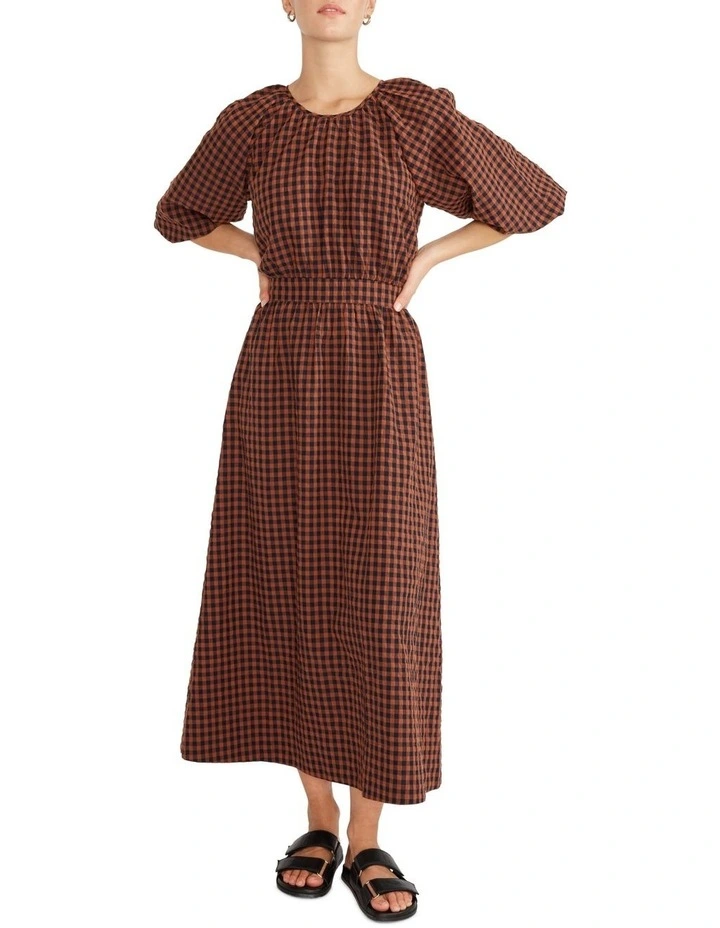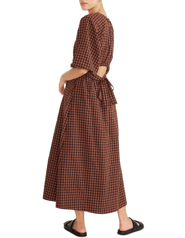 The Cleo Back Midi Dress by Staple the Label is a midi length garment with a round neckline and center back enclosed button closure. This midi features an elasticised cut out and self tie, half length blouson sleeves and elastic cuffs.Β