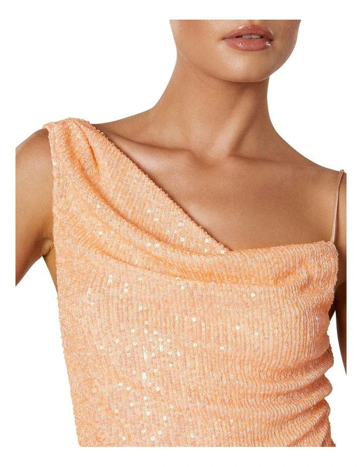 - Asymmetrical one shoulder, cowl drape neckline. Adjustable string shoulder straps